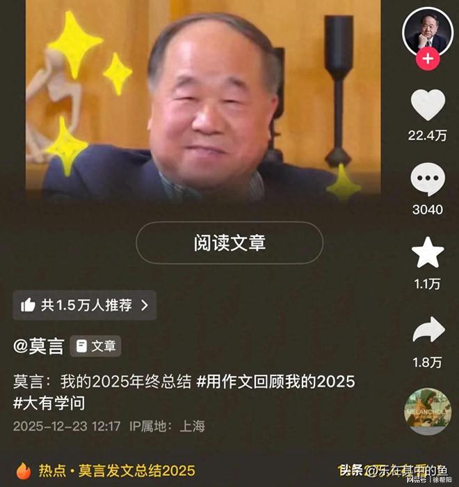 《出圈莫言的“烟火:诺奖作家的日常生活中隐藏着怎样的共鸣?》这两天,作家莫言再次成为社交平台热议的中心