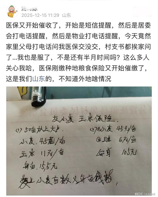 近日,有网友发帖称,又开始征医保代收了。先是短信提醒,然后是居委会的电话,然后是物管的电话。今天,我的父母打电话给我,问我是否缴纳了医疗保险。村支书也挨家挨户……我也接受了。还没半个月吗?这么多人担心我。我刚刚缴纳了医疗保险,种粮保险又开始缴费了。是我们山东省的。不知道其他地方的情况如何。此文引发网友热议。有网友表示,中国的医保体系靠农民撑起了半边天。即使是这个规模,它也无法容纳大量的人群。他们付钱但消费较少,因此他们支持城市工人阶级。有网友评论说,那你就应该主动一点。我们已经习惯了o 很长一段时间。今天我们都说赔钱也能避祸。我们一起工作一年了,没有生病,没有灾祸。你感觉好些了吗?有网友悄悄表示,现在学校里也有进展了。从前年开始,突然从320涨到380、400,很多人不愿意交,所以时间就往后推迟。学校随即发出通知。孩子们问父母是不是我们家买的。然后我们就开始调整班级里没有交钱的家庭数量。今年,我们也在12月之前开始调查,看看有多少家庭没有付款。有网友评论说我舅舅和表弟哮喘7天住院治疗花了2500块。这意味着,如果你工作一个月,你只需要住院7天。你觉得贵吗?这是报销后的价格。是不是相当于别人的钱记在你的名下d 回到你的名字?事实上,你原本要支付的金额是2500。无独有偶,随后广西有网友举报了该集团的一则通知,同样是关于医保征缴工作,引起网络关注。从上述内容来看,充分说明了各地对城乡医疗保险缴费工作的高度重视,也说明了当前时间的紧迫性。多地2026年城乡居民医疗保险缴费工作已实际启动,多地截止日期为2025年12月31日。我国基本医疗保险参保率继续稳定在95%左右。职工和灵活就业人员的医疗保险缴费比例因保险种类和地区不同而有所差异。从参保率看:全国基本医疗保险参保人数保持稳定13.6亿元,覆盖率95%。这一水平多年来一直保持稳定。目前,各省城乡医疗保险政策存在差异。例如,部分地区缴费标准为每人400元,政府补贴为700元。如果2026年不缴纳费用,2027年费用将增加800元。缴费截止日期为2025年12月30日,到期后缴费为每人400+700=1100元。值得提醒的是,2026年基本医疗保险缴费时间已结束,各地村干部需压住压力,及时告知不上门缴费的群众缴纳医疗费。也许人们并不是不想缴纳医疗保险,而是他们也知道缴纳医疗保险可以有效防止人们返贫或因病致贫。然而,在某些情况下,家庭有人口多,劳动力少,家庭要交纳两三千(每人每年400元),很多长辈不愿意或者无法接受伊托。所以尽量把医保单预支给家里长辈的孩子,这样会比较好。其实,小时候,为家人购买医疗保险就是孝顺的表现。毕竟,现在看病难、看病贵是事实。另外提醒大家,重度残疾人、低保户、五保户等特殊群体有医疗费用减免政策,缴费时请注意。总之,为了您和家人的健康,花钱买平安吧!你对此有何看法?